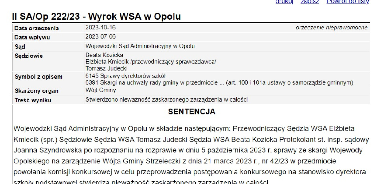 Rzecz dotyczy powołania trzech komisji konkursowych niezbędnych do przeprowadzenia konkursów na stanowiska dyrektorów szkół podstawowych w Zielinie, Dobrej i Komornikach. WSA wszczął postępowanie w tych sprawach na skutek skargi Wojewody Opolskiego Sławomira Kłosowskiego, którego nadzór prawny stwierdził nieprawidłowości w trzech zarządzeniach wójta. W tej sytuacji wojewodzie nie pozostało nic innego jak skierować sprawę do sądu. WSA jedynie potwierdził wątpliwości wojewody i „stwierdził nieważność zaskarżonych zarządzeń wójta z 21 marca 2023 roku w całości”.